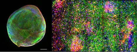 Links: Darstellung eines “Bioengineered Neuronal Organoids” (BENO) hergestellt nach einem von Zafeiriou et al. publiziertem Verfahren; die Ausbildung der neuronalen Netzwerkstruktur wird durch Färbung von neuronalen Markerproteinen (Microtubule-associated protein 2; blau) und Neurofilament (grün) sowie Gliazellen (Glial fibrillary acidic protein; rot) dargestellt. Maßstab: 0,5 mm. Rechts: Vergrößerung der neuronalen Netzwerkstruktur in einem BENO. Neuronale Axone sind nach Färbung des Neurofilament Proteins in Grün, aktvierende glutamaterger Neurone in Rot und Zellkerne in Blau dargestellt